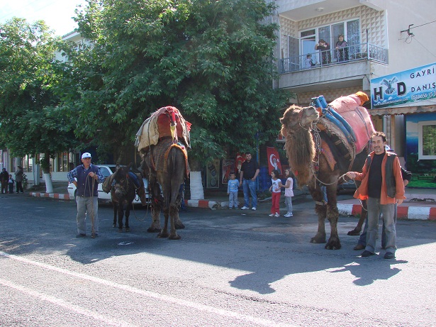 Biz belediye binası önünde sohbet ederken, turunu tamamlamış olan develerin yaklaştığını görüyoruz.