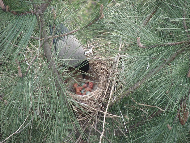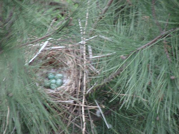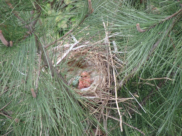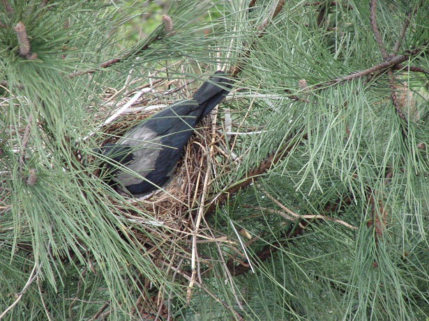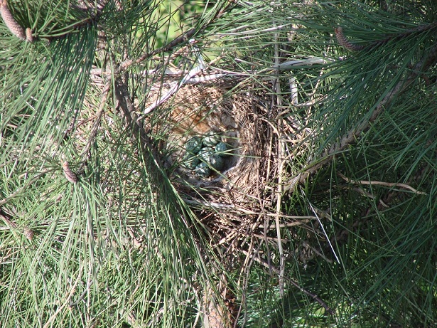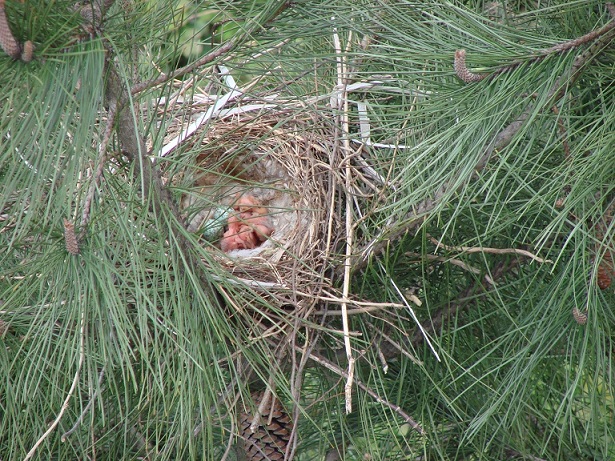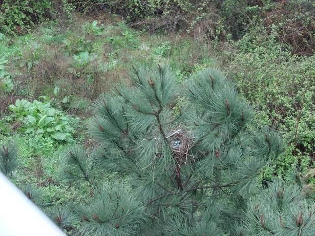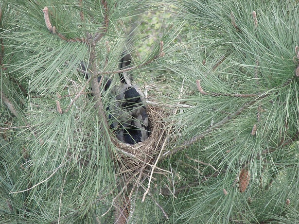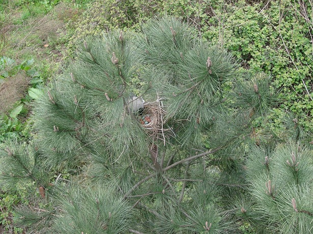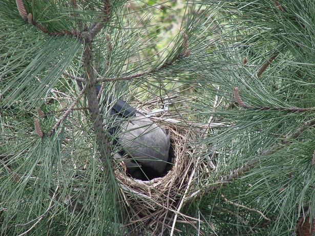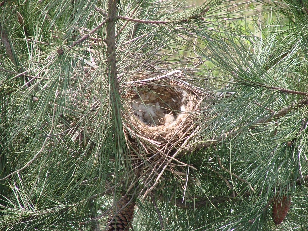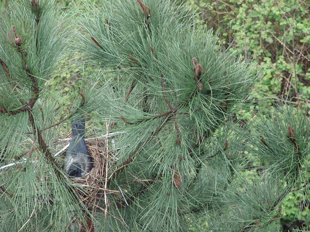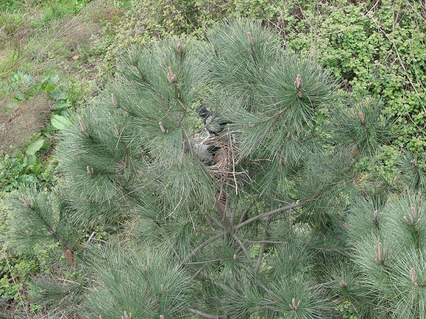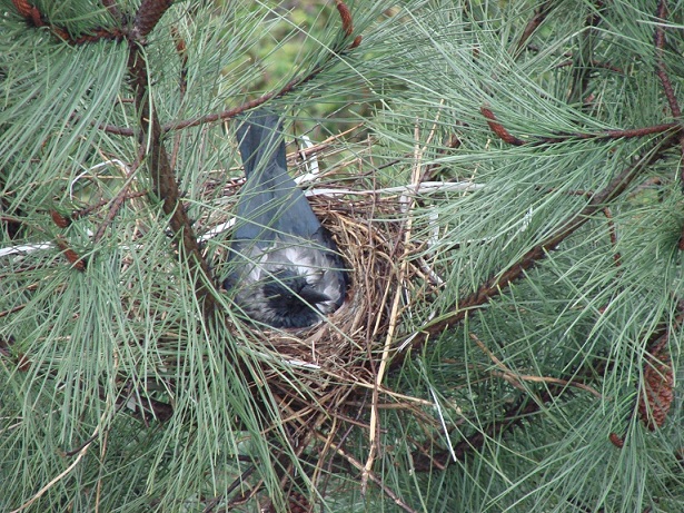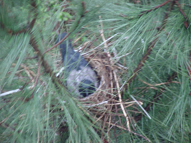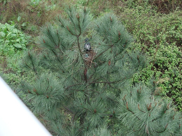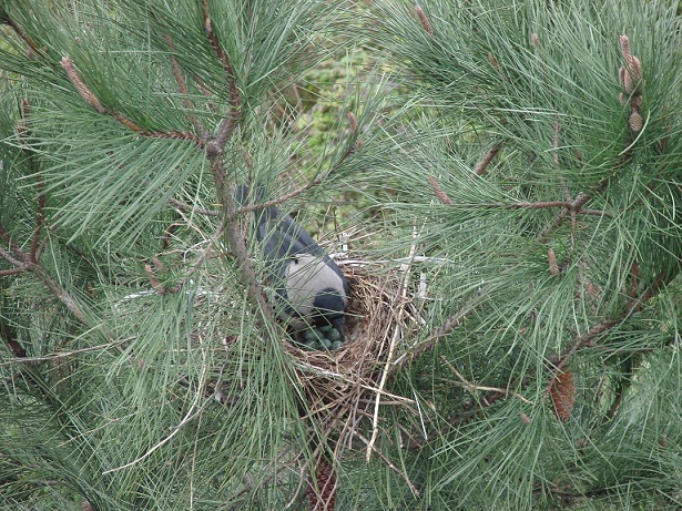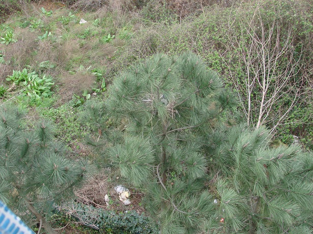Hava güneşli. Pencereden dışarı bakarken aşağıdaki çam ağaçlarından birinin üzerinde farkettim; yuva var…