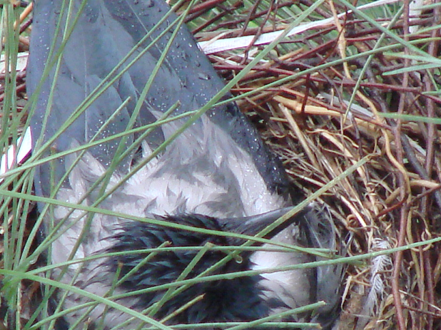 Bu gün gene yuvasının üzerinde yatarken kafasını yumurtaların arasına sokup onları karıştıran kuşa bakarken bir tuhaflık hissettim. Ağzında beyaz bir şey vardı acaba yem mi diye düşünürken bunun yumurta kabuğu olduğunu anladım. Hemen fotoğraf makinesini almaya gittim ve pencerede kıpırdamadan bekledim.