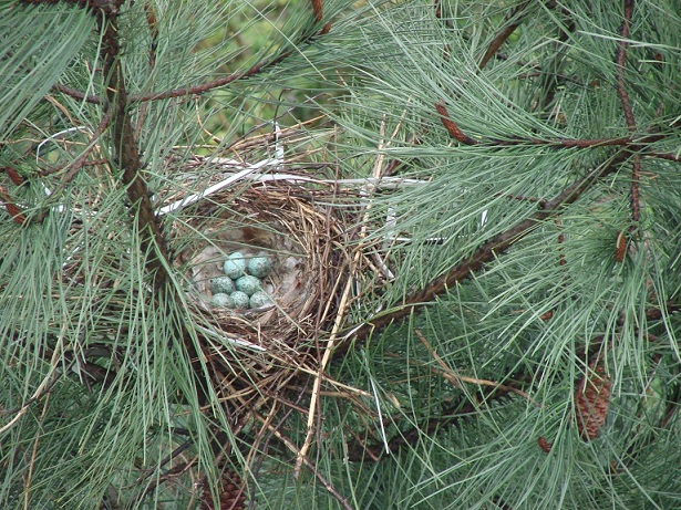 Açık bir hava, pencere önünde bakınırken, aşağıdaki çam ağacı üzerindeki yuvayı ve içinde oturan kuşu gördüm.